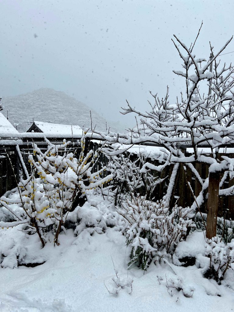 枝に積もった雪や白く覆われた庭を見ると